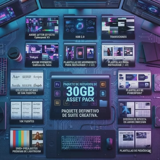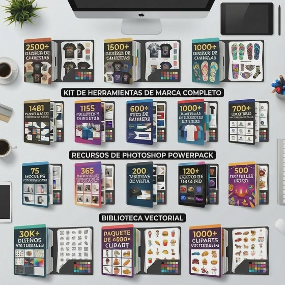 Este producto es una colección extremadamente grande, de múltiples terabytes de recursos digitales de nivel profesional, dirigida principalmente a diseñadores gráficos, vendedores de impresión bajo demanda, agencias de marketing y cualquier persona que use Adobe Suite (Photoshop, After Effects, Premiere, Illustrator) y Corel Draw. Ofrece recursos completos desde diseños de camisetas y gráficos vectoriales hasta plantillas de movimiento y paquetes completos de papelería empresarial.
